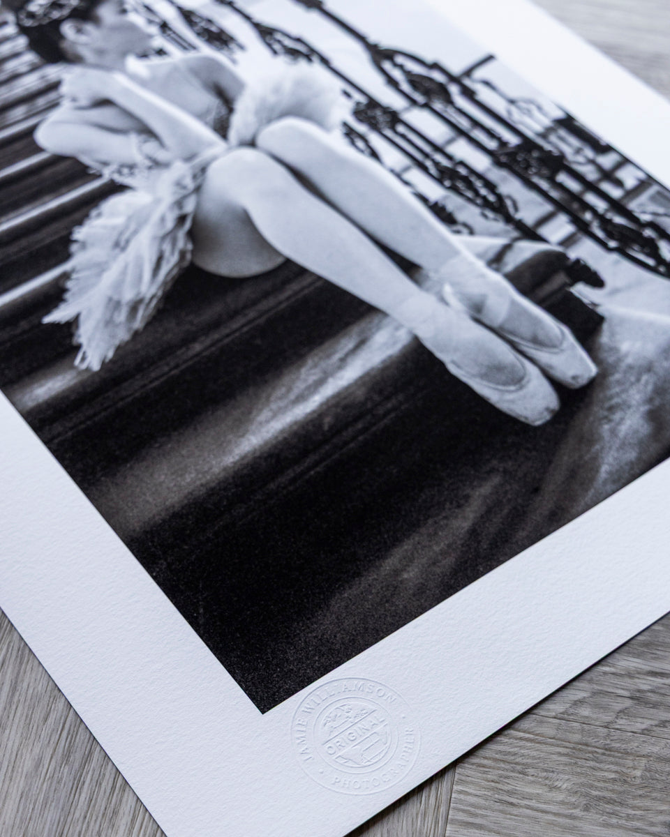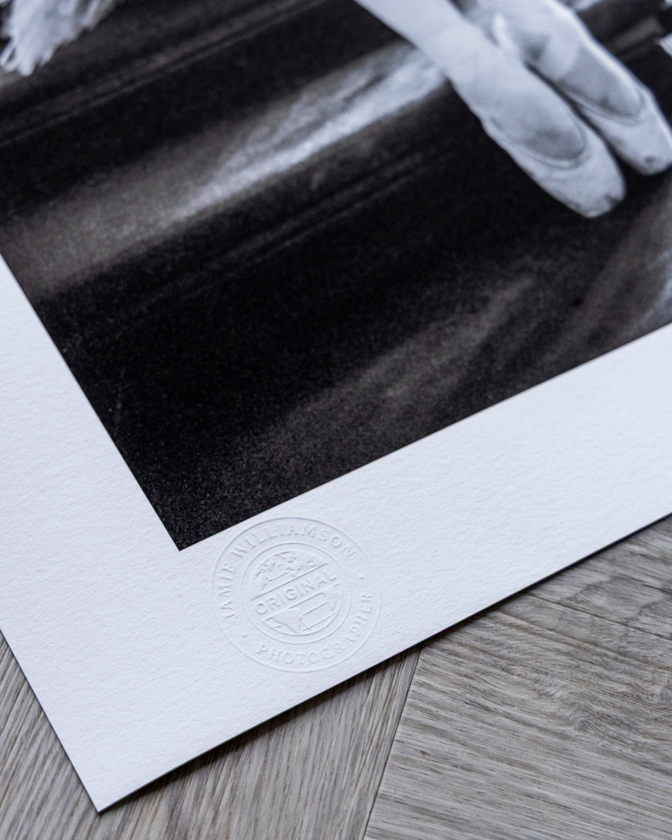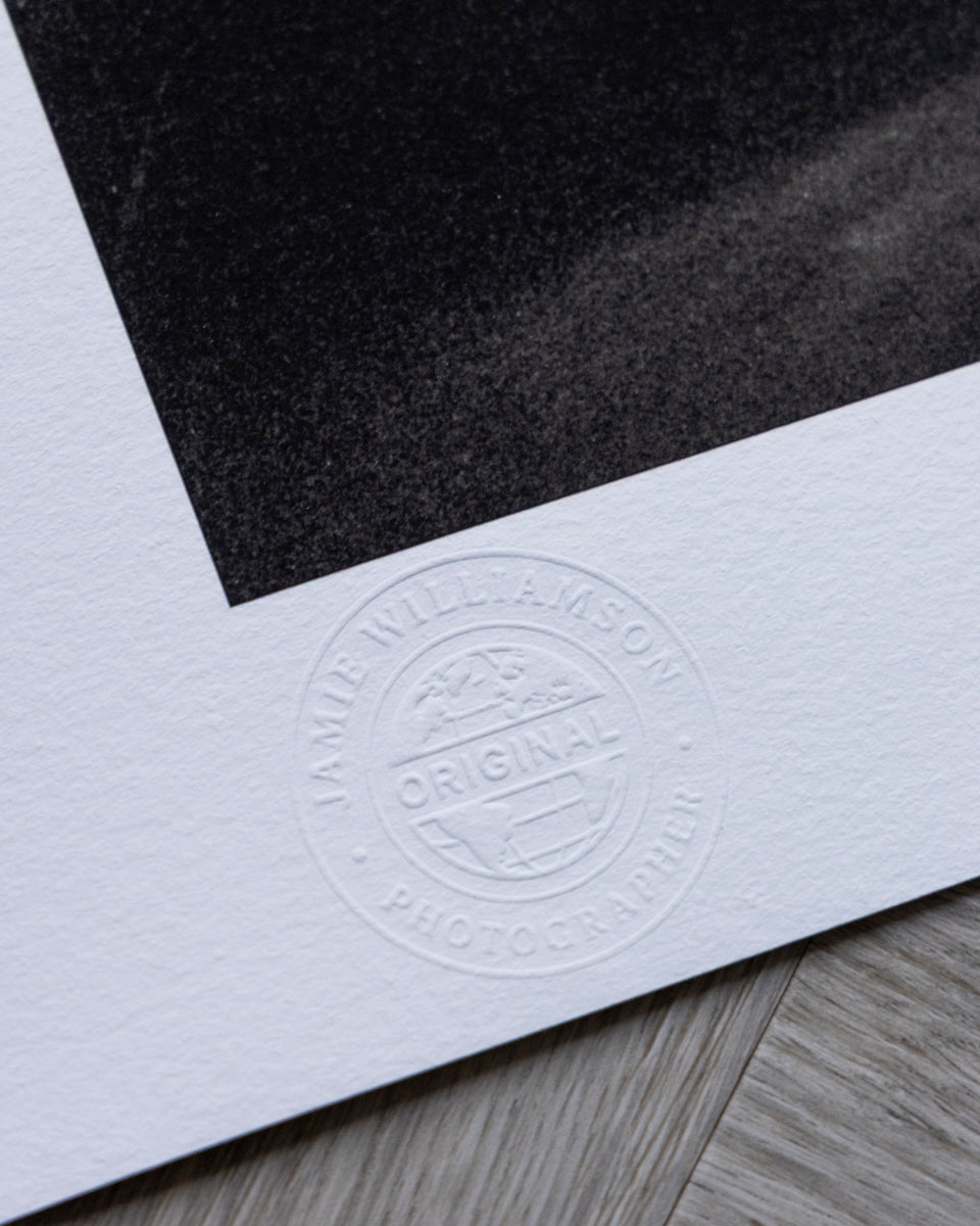 This images is available in one size as an open edition print, printed on archival museum quality matt Hahnemühle fine art paper with a large white border to aid framing behind glass, embossed on the front, stamped, signed & dated on the back.